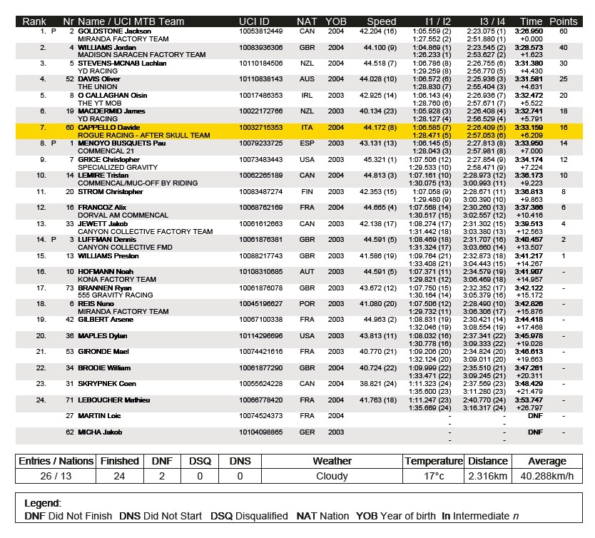 “Daddy” deve invece fare i conti con la pioggia che comincia a cadere ma per sua fortuna non così copiosa (come da metà gara in poi) da compromettere una discesa che con qualche frenata in meno sul finale gli avrebbe regalato un super tempo. Il piazzamento resta di tutto rispetto P18.