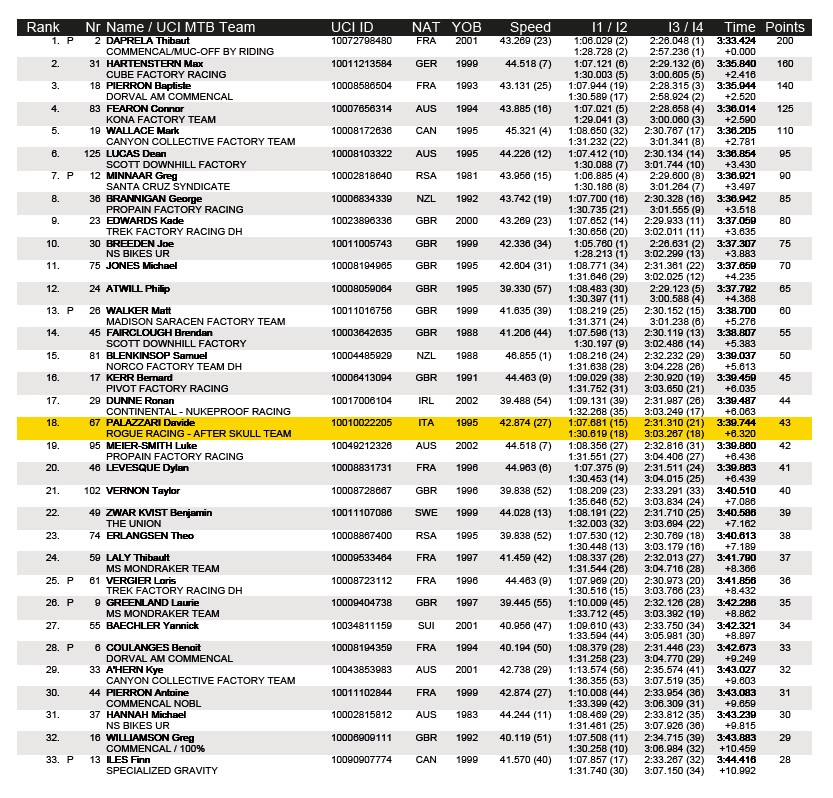 La nuova pista di Les Gets “ha dentro tutto quello che si può desiderare”. Veloce come la vecchia DH ma, grazie alla lunga e ripida sezione nel bosco piena di radici, presenta una sfida tecnica ben più complessa. I rider, pur riconoscendone la natura implacabile, ne sono rimasti entusiasti; complice anche il ritorno del pubblico che finalmente è tornato a bordo pista ad incitare i suoi beniamini. A Leogang i nostri non avevano ottenuto l'accesso alla finale proprio a causa dei passaggi sconnessi e infangati nel bosco, così il team era teso prima delle qualifiche ma Cappello e Palazzari dimostrano di aver fatto tesoro di quella esperienza e gestiscono le qualifiche al meglio conquistantdo rispettivamente il 9° e 28° posto.
