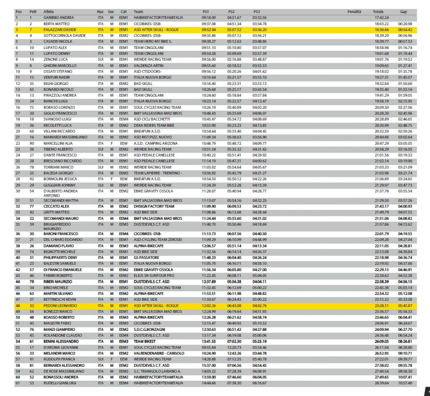 A Valle Varaita tre giorni di gare estenuanti hanno messo alla prova un agguerrito plotone di indomiti piloti spesso martellati da una pioggia implacabile. I primi due giorni tutte le prove speciali sono state disputate a Sampeyre così i nostri rider hanno potuto sfruttare la giornata di Venerdì per prendere confidenza con l’insidioso tracciato senza incorrere in troppi rischi inutili. Palazzari conclude al 7° posto mentre Pedoni è 38°.