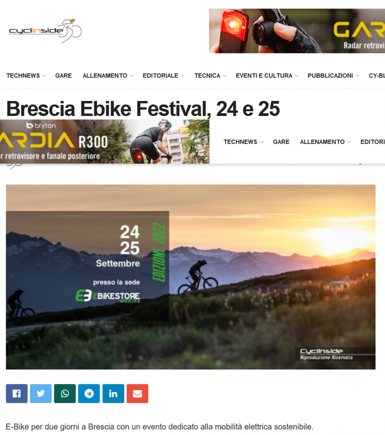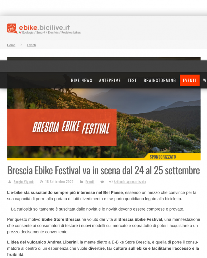 BRESCIA EBIKE FESTIVAL, 24 E 25 SETTEMBRE DEDICATI ALLE ELETTRICHE