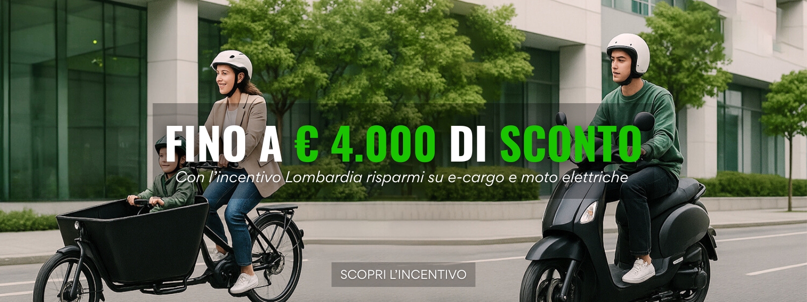 Stai pensando di acquistare una e-cargo bike o una moto elettrica? Non aspettare: con gli incentivi della Regione Lombardia attivi da aprile 2025 e la nostra super promo in esclusiva showroom, oggi puoi risparmiare fino a 4.000€ sull’acquisto del tuo nuovo mezzo green.