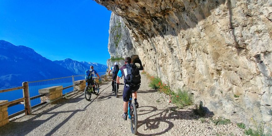 Da questo momento inizia la discesa Trota. Attenzione perché non sarà una passeggiata. Non avremo strapiombi ma bensì passaggi tecnici su un terreno generalmente sassoso. Sbucherete poco prima della galleria di Riva del Garda. Qui ora dovremo girare a destra in direzione Limone. Tratto di trasferimento prima dell’inizio dell’ultima chicca della giornata: la bellissima ciclabile sospesa sul Lago Garda che troverete dopo un paio di km circa sulla vostra sinistra.