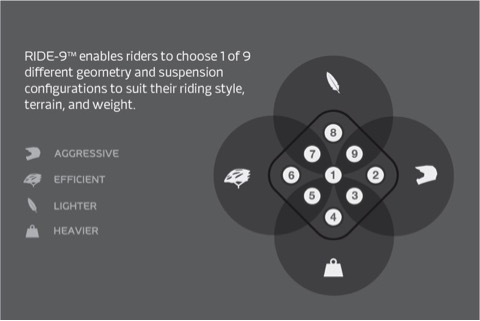 Il Ride9 di Rocky Mountain è un sistema (di serie sulle Powerplay) composto da due inserti eccentrici posizionati sull'attacco inferiore dell'ammortizzatore che permettono di variare gli angoli e la progressività della sospensione.