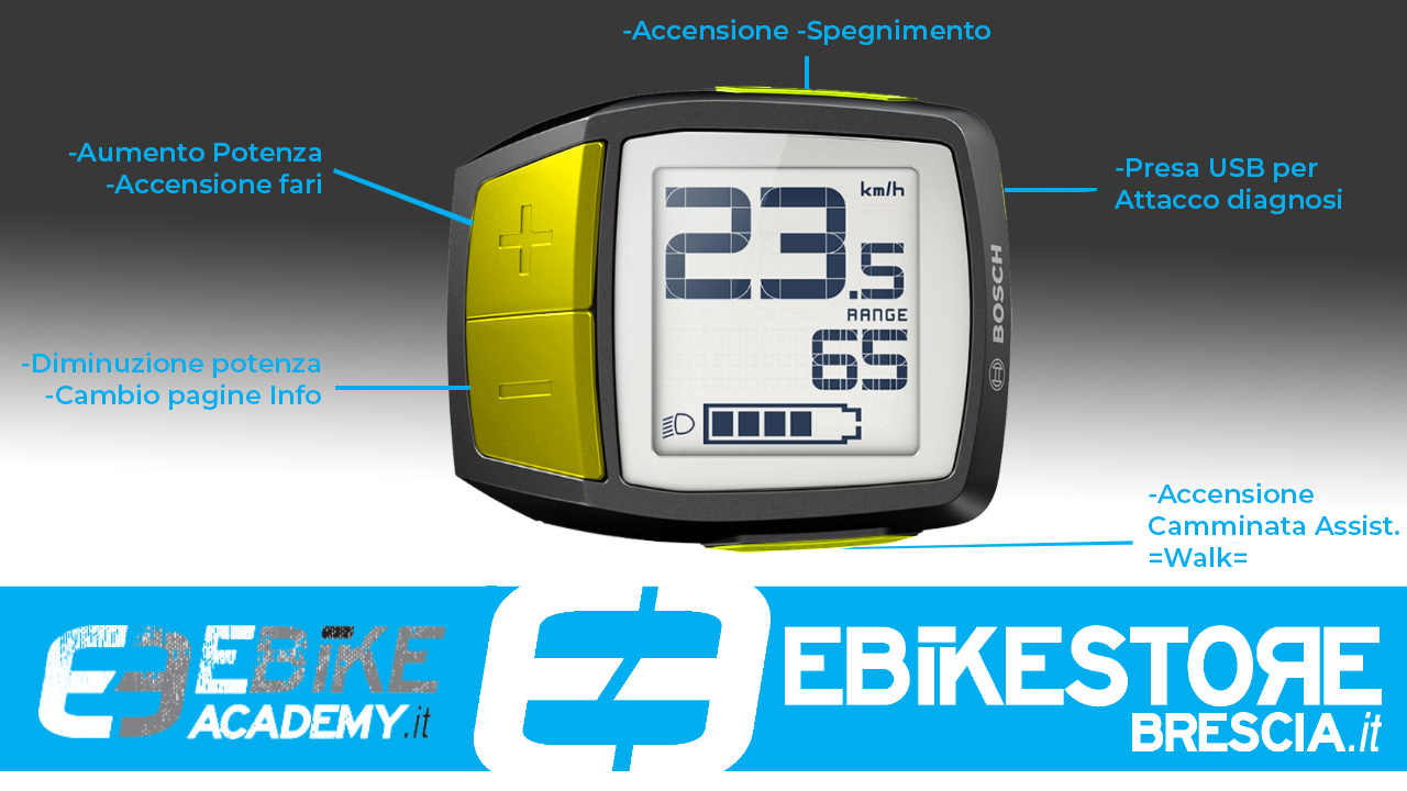 - PULSANTE DIMINUZIONE POTENZA/CAMBIO PAG.: Premendo per 1 secondo, puoi diminuire il livello di assistenza, mentre premendo per 2,5 secondi, potrai cambiare la pagina delle informazioni (vedi di seguito le funzioni)